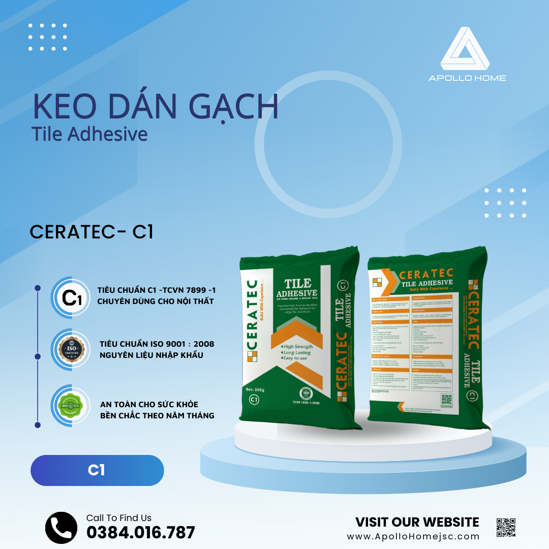 Vữa ốp lát gạch/đá cao cấp CERATEC C1 gốc xi măng với thành phần ( Xi măng poland, Cát vàng sấy khô và sàng tuyển theo cỡ hạt tiêu chuẩn, Phụ gia chống co ngót, Phụ gia hóa dẻo, Phụ gia polymer và một số thành phần khác) là dòng sản phẩm chuyên dùng cho các loại gạch / đá thông dụng như Ceramic, Các dòng gạch/ đá không hút nước có kích thước lên đến 600 x 600 hoặc có trọng lượng tối đa không quá 25 kg/m2