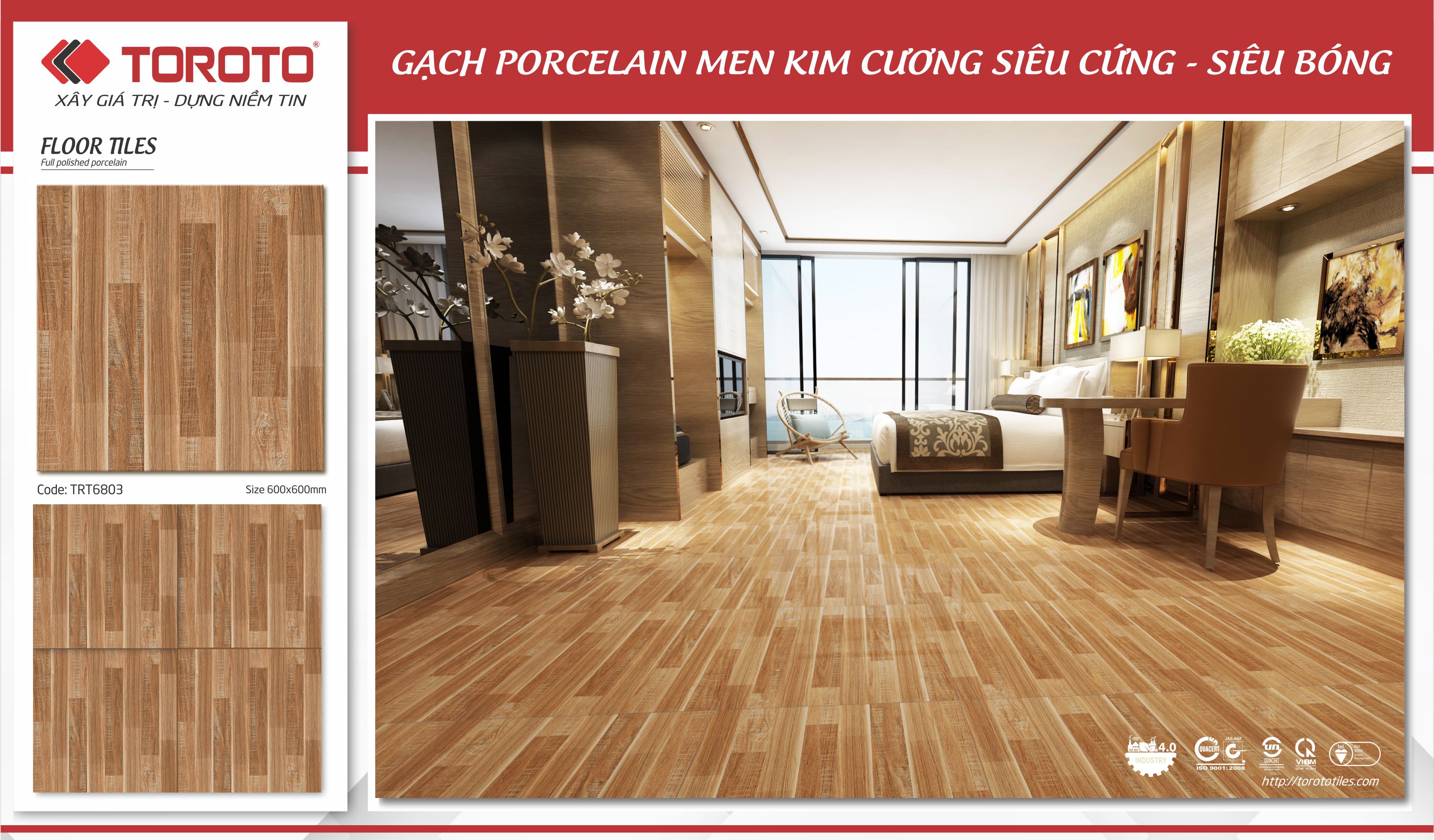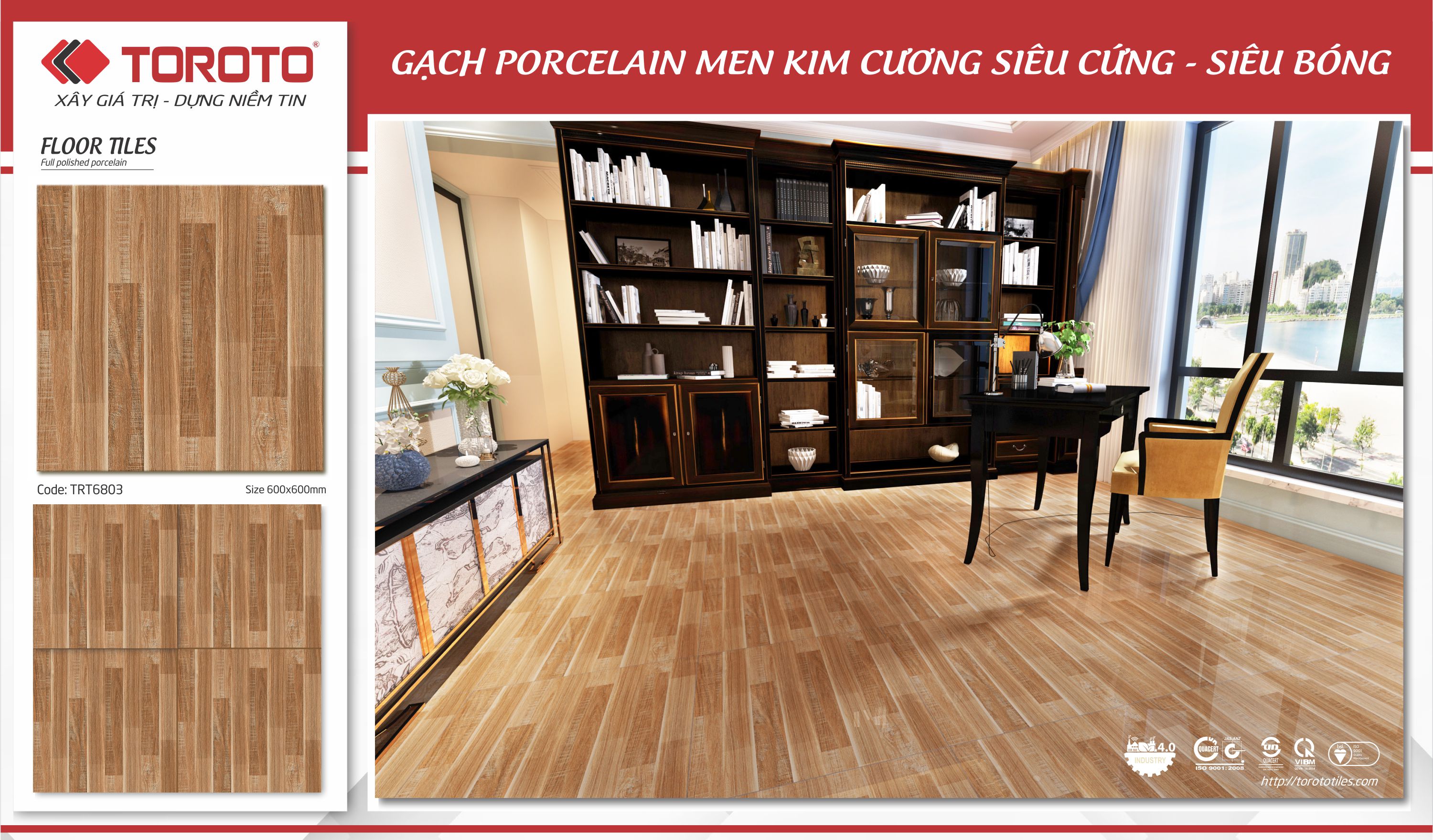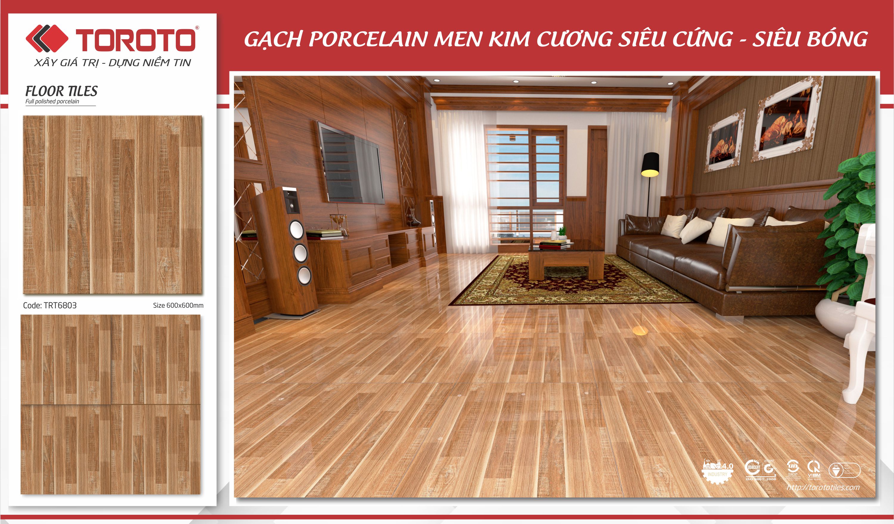 Gạch lát nền 600 x 600 xương bán sứ, Men bóng kính, mài Nano, công nghệ và men màu 100% Châu Âu .