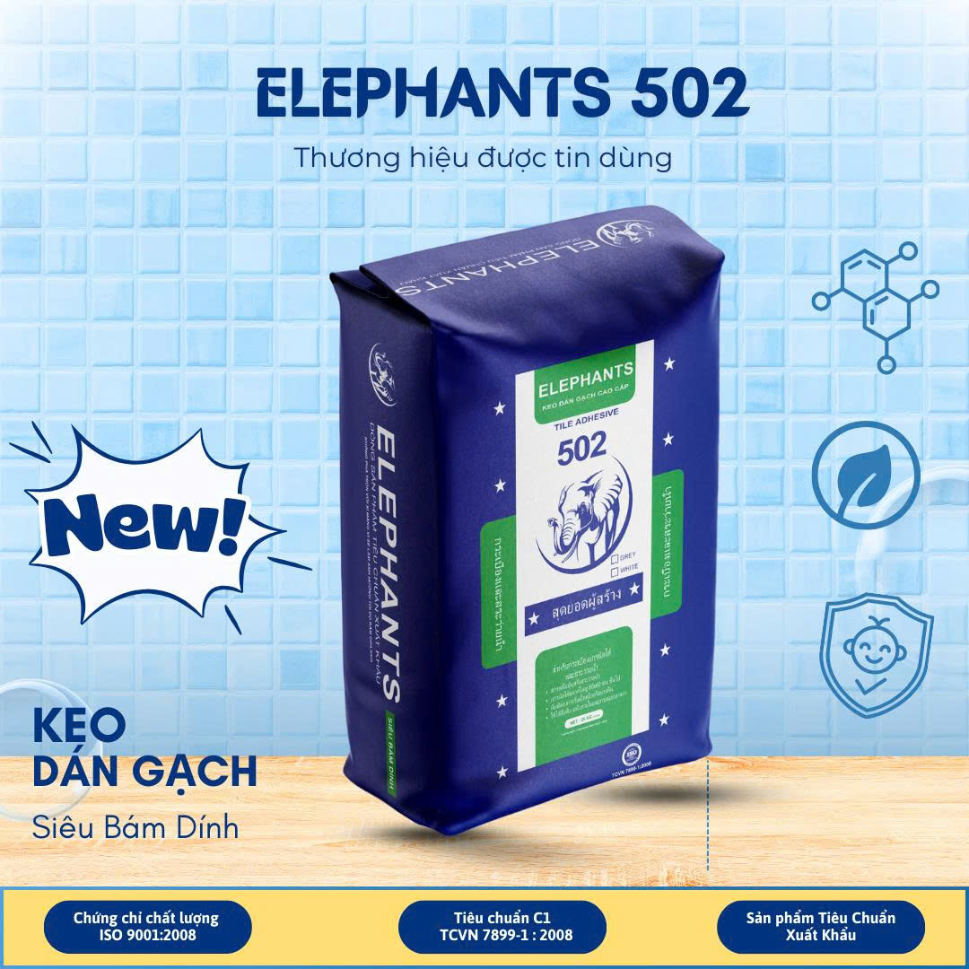 Vữa ốp lát gạch/đá cao cấp ELEPHANTS 502 (GREEN) gốc xi măng với thành phần ( Xi măng poland, Cát vàng sấy khô và sàng tuyển theo cỡ hạt tiêu chuẩn, Phụ gia chống co ngót, Phụ gia hóa dẻo, Phụ gia polymer và một số thành phần khác) là dòng sản phẩm chuyên dùng cho các loại gạch / đá thông dụng như Ceramic, Các dòng gạch/ đá không hút nước có kích thước lên đến 600 x 600 hoặc có trọng lượng tối đa không quá 25 kg/m2